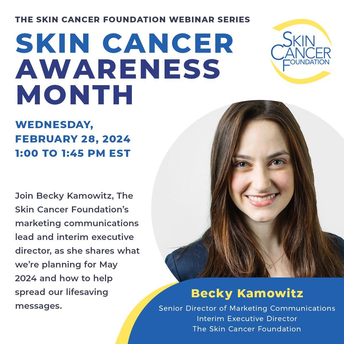 Learn more about the importance of Skin Cancer Awareness Month and ways to engage consumers around it. Join Staci Pierson, senior director of strategic partnerships, and Stephanie Ogozalek, program partnerships director, to learn about The Skin Cancer Foundation’s plans for May 2025 and how you can leverage your Corporate Council membership and Seal of Recommendation status in your communications. Please contact corporatecouncil@www2.skincancer.org for more information.
