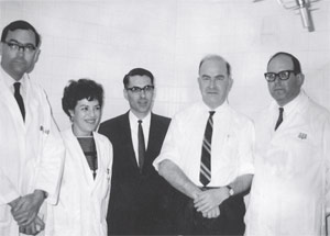 The First Mohs Team at NYU. Right to left: Dr. Perry Robins, Dr. Frederic E. Mohs, Dr. Alfred W. Kopf, Leona Mandell, Dr. Hugh Brown.